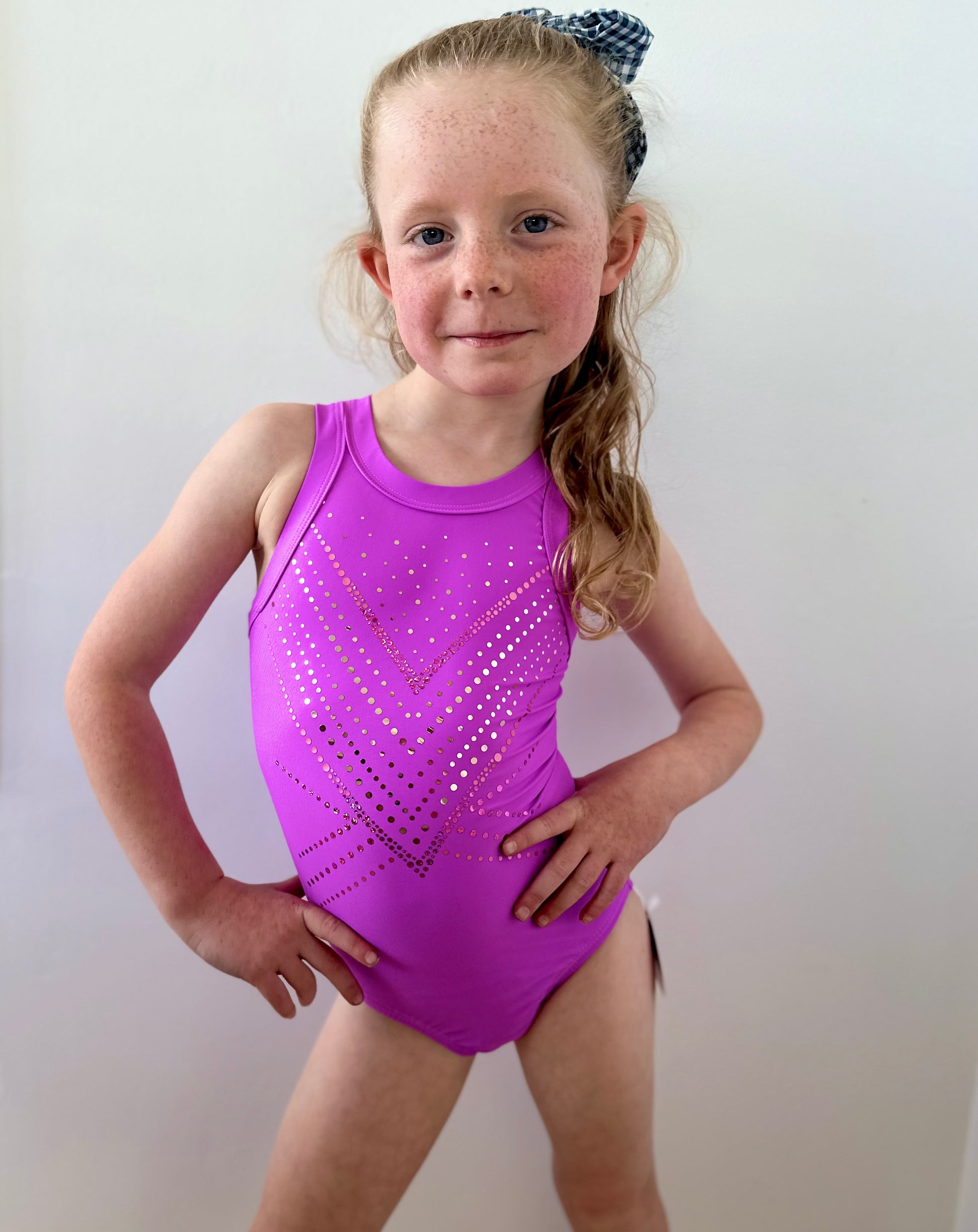 Radiant and refined, the Florence leotard stuns in an ultra-violet hue that’s impossible to ignore. The front shimmers with a beautiful blend of rose gold and pink spangle, adding the perfect touch of sparkle. Finished with a delicate strappy back, Florence is made for gymnasts who love to stand out with elegance and confidence. ✨💜