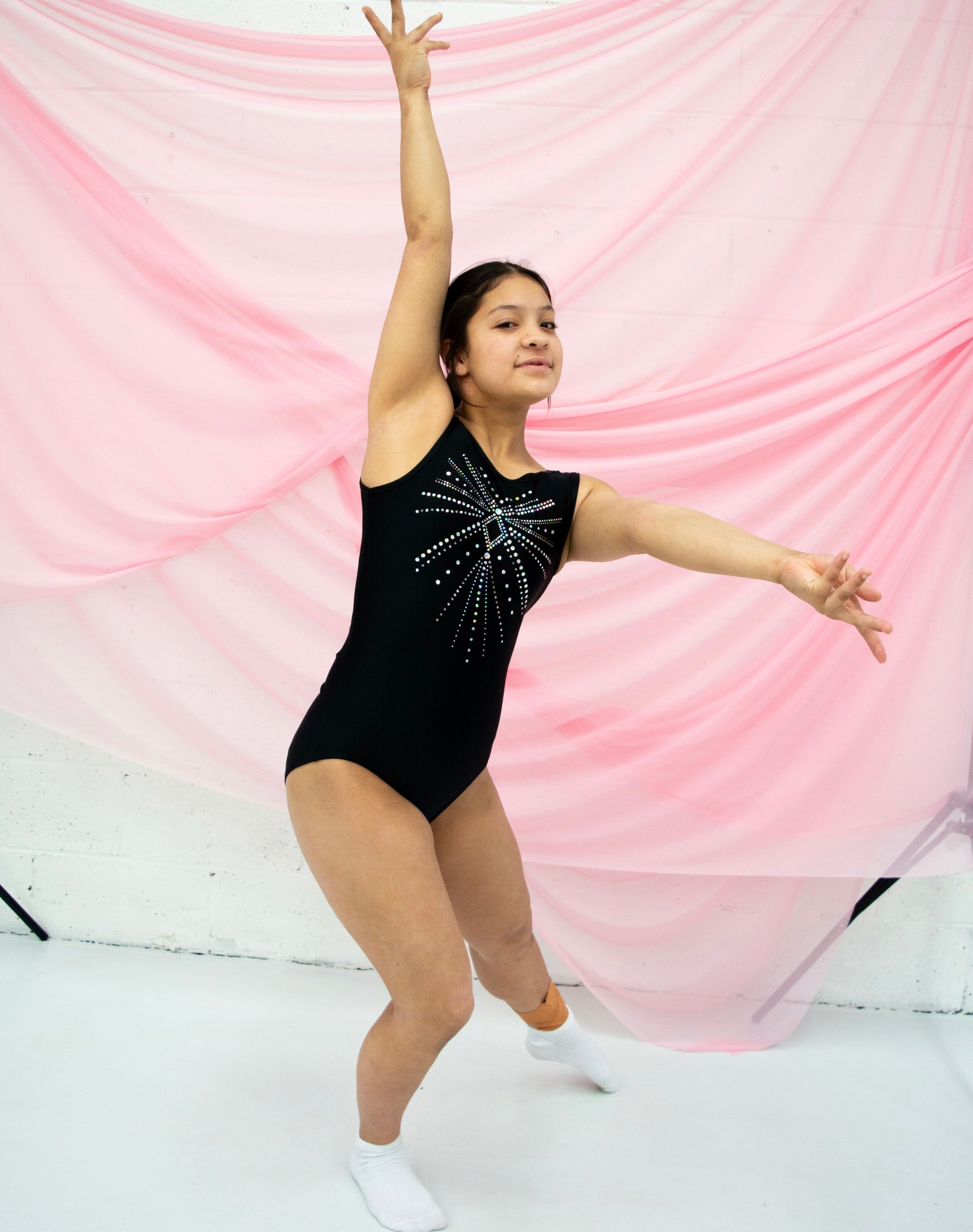 Elegant. Striking. Unforgettable. The Glamour Leotard is the definition of refined performance wear. This all-black leotard features a dazzling display of silver spangle detailing across the front, adding just the right amount of sparkle to catch the light with every movement.